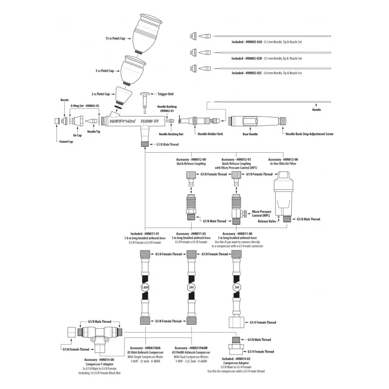 FLOW-TF V2 Airbrush Top Feed 0.3/0.5/0.8mm 2/5/13cc 1.8m Slang