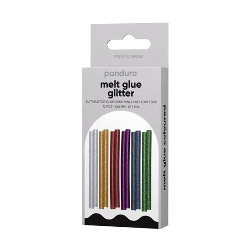Smält Lim, vissa kreativa planer kräver roligare smältlim än de vanliga vita eller genomskinliga varianterna! Här kan du välja på lim med roliga färger eller lim med roliga färger och glitter. Perfekt för att få till den roliga touchen på DIY, kort, smycken med mera. Limmet gör sig väl på papper, kartong, plast, glas, sten och keramik. Stavarna är Ø 7 mm, längd 10 cm. Lämpliga till Panduros limpistoler av modellerna Mini och Midi (Low temp). Förpackningen innehåller 12 stavar. 6 glittriga färger.