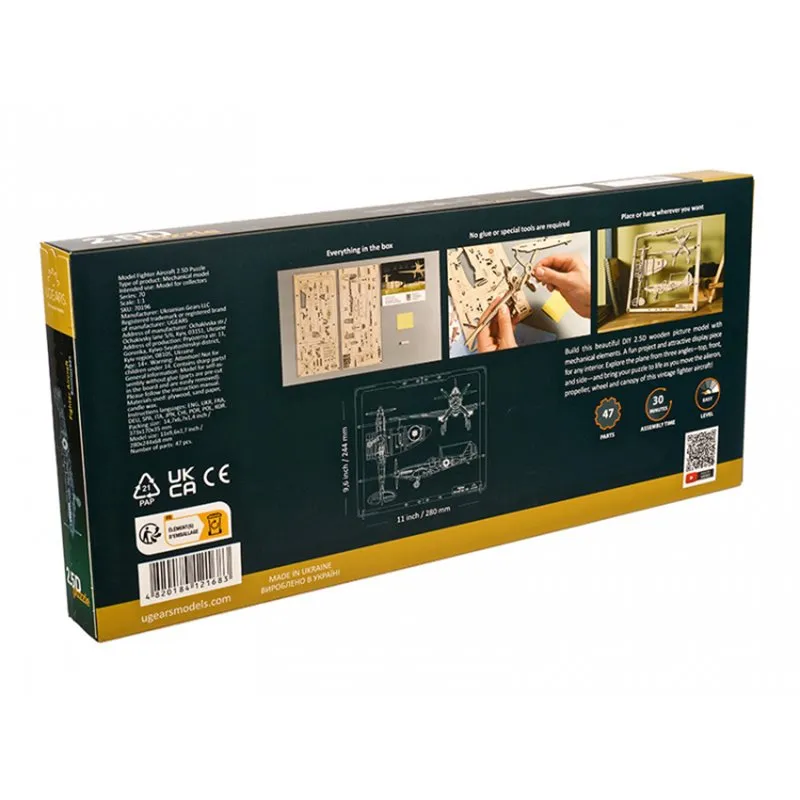 Ugears proudly introduces the Fighter Aircraft from our Classic Vehicles collection—the first series in a new line of Ugears 2.5D puzzles! This cool DIY 2.5D wooden aircraft model has movable elements and comes in its own frame, suitable for hanging on a wall or placing on a desk or shelf. The Fighter Aircraft depicts a classic 1940's era Spitfire, the famous WWII fighter used by the RAF and other allies. The picture model presents 3 perspectives (front, top and side views) and has several moving parts, including aileron, propeller, wheel and canopy, to bring your puzzle to life!