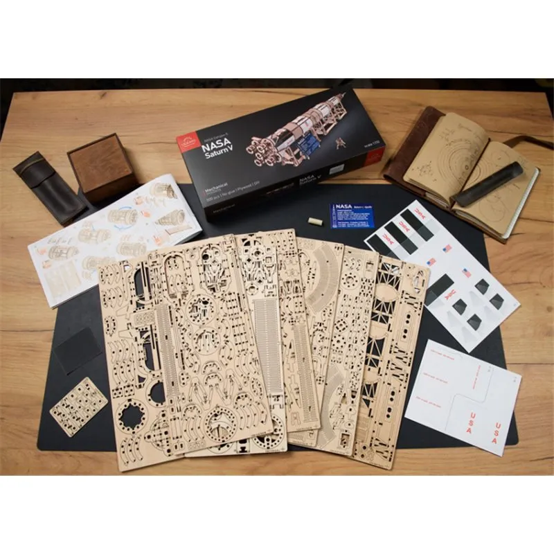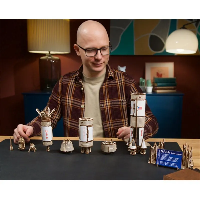 The Ugears NASA Saturn V three-stage rocket is rated "Advanced" level, for experienced builders, and makes a majestic display piece for your living room, bedroom or office. Like all Ugears wooden models and 3D puzzles, the Saturn V and all its component parts assemble without glue, and can be built without special tools, following the step-by-step, illustrated instructions in 11 languages (English, Ukrainian, German, Spanish, French, Italian, Portuguese, Polish, Japanese, Chinese, and Korean). Made from art-quality composite wood, Ugears models can be left in their attractive natural wood state, or colored, stained or painted in a color scheme of your choosing (paints not included). The Saturn V kit includes several spare parts in case of breakage during assembly, and you can always contact our customer service team for additional replacement parts, free of charge (including shipping). We can also answer questions or help troubleshoot if you encounter any difficulties during your build.