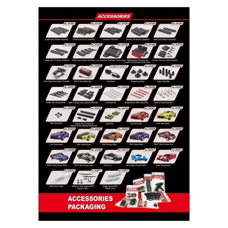 Super series slot racing sets feature with mechanical lap counter, can set up from 1 to 10 laps to race your friends. Compatible with USB power (Input: 5V/2A) and transformer (Input: 6V/1.5A).