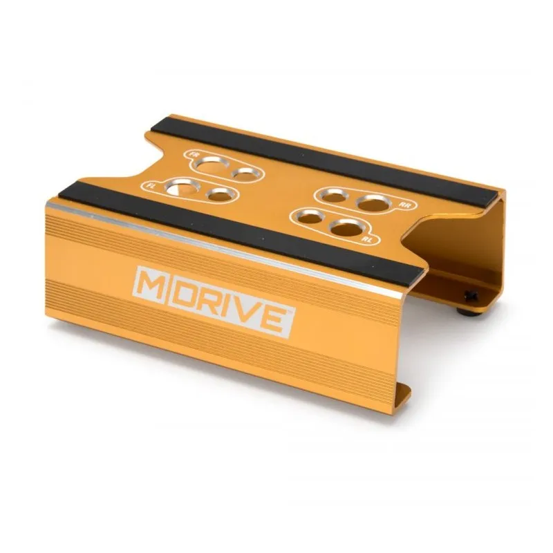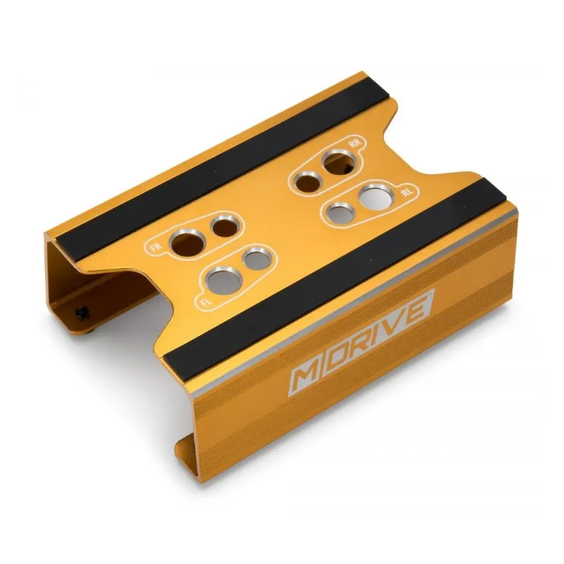 This is a professional looking car stand in gold anodized aluminium that fits many different 1/10 & 1/18 scale RC cars. It's a perfect stand for your vehicle while you are wrenching. As an extra feature it also has dual set of holes for your shocks.Specs: